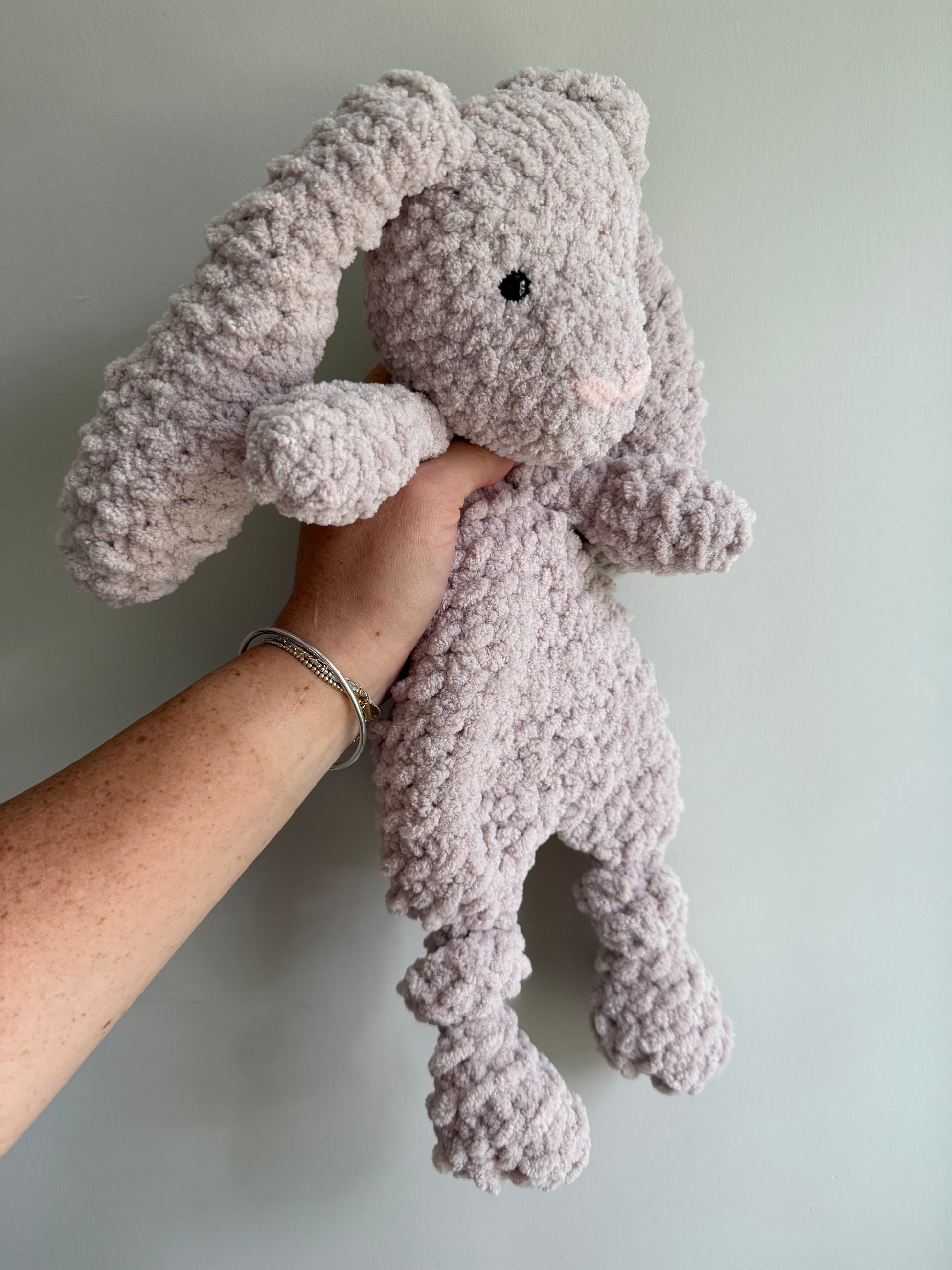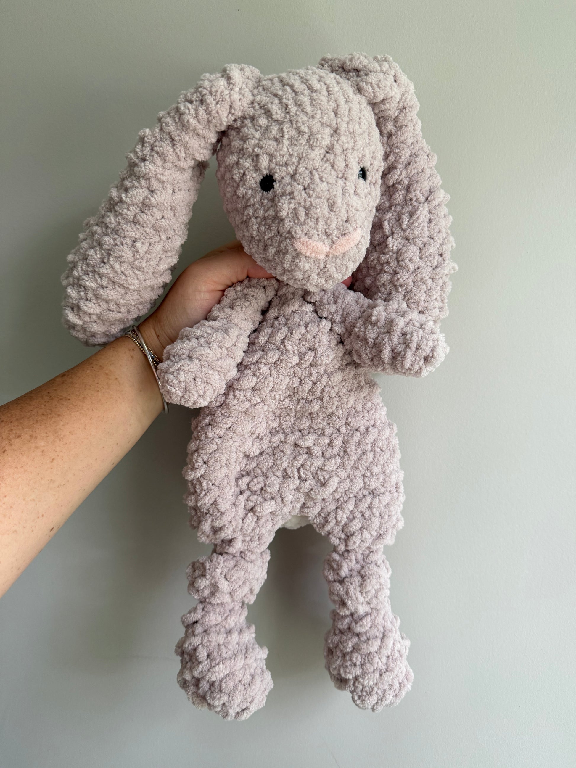 This bunny lovey is a classic! Made in the medium size pattern, approximately 15 inches tall. This particular bunny is made in a greyish/brown yarn called Mushroom. The head is stuffed with a hypoallergenic polyfil and Oeko-Tex yarn is used. Safety eyes are used and reinforced for extra security. Loveys can be washed on delicate in garment bag and laid flat to dry if necessary, otherwise spot clean only to preserve the longevity of the critter.