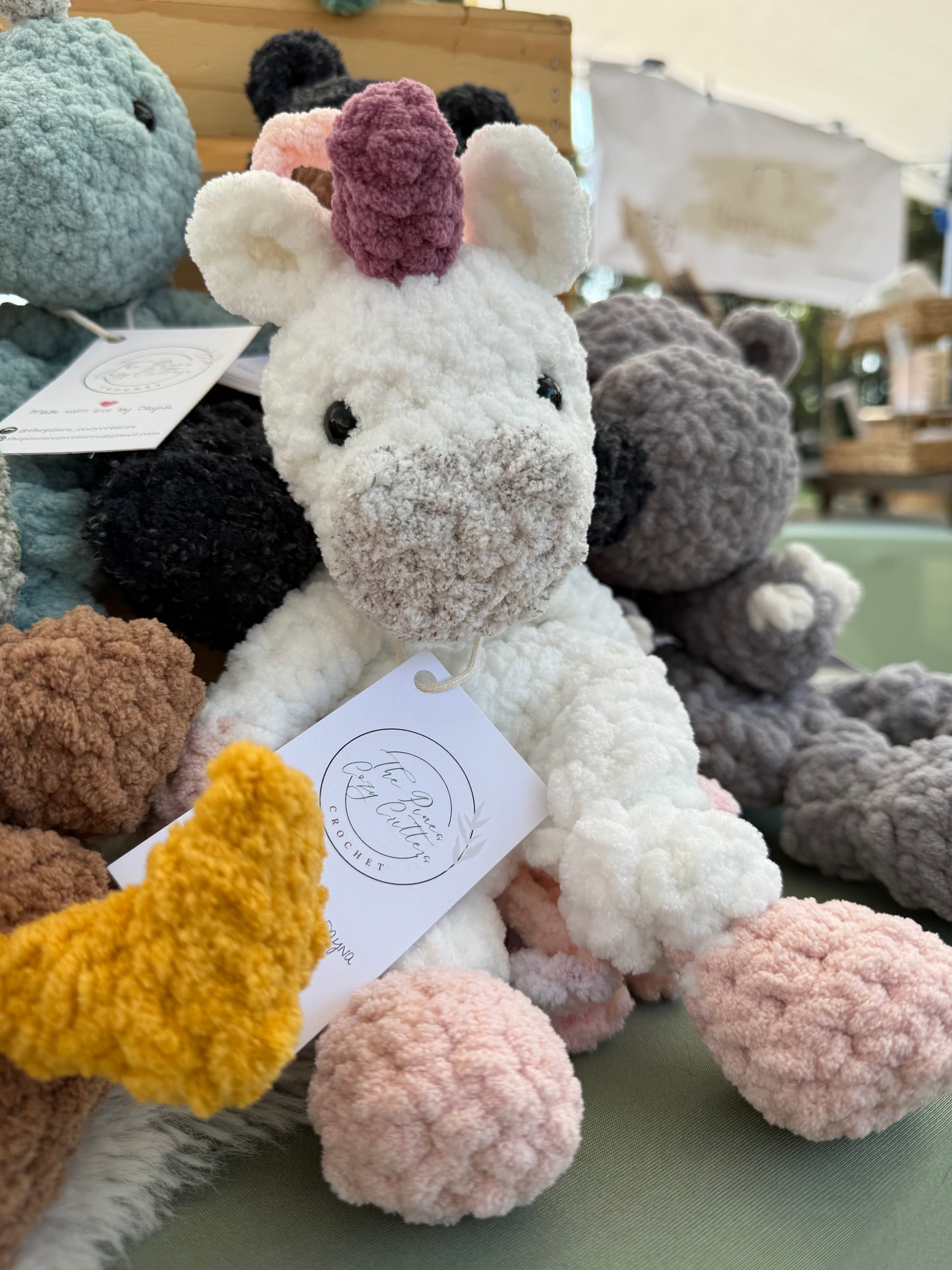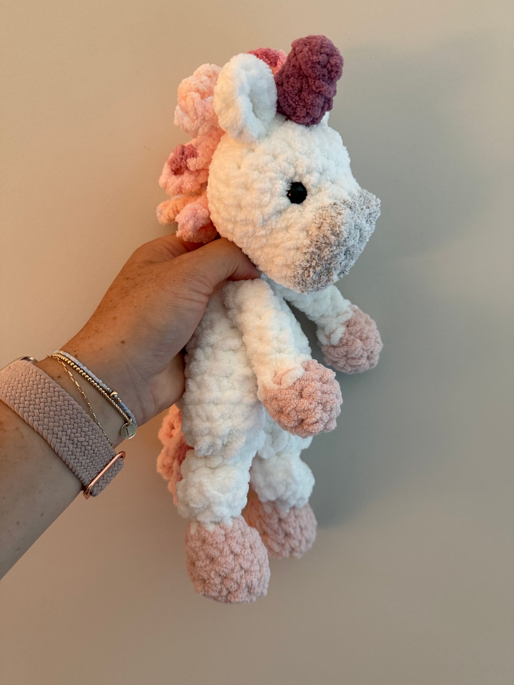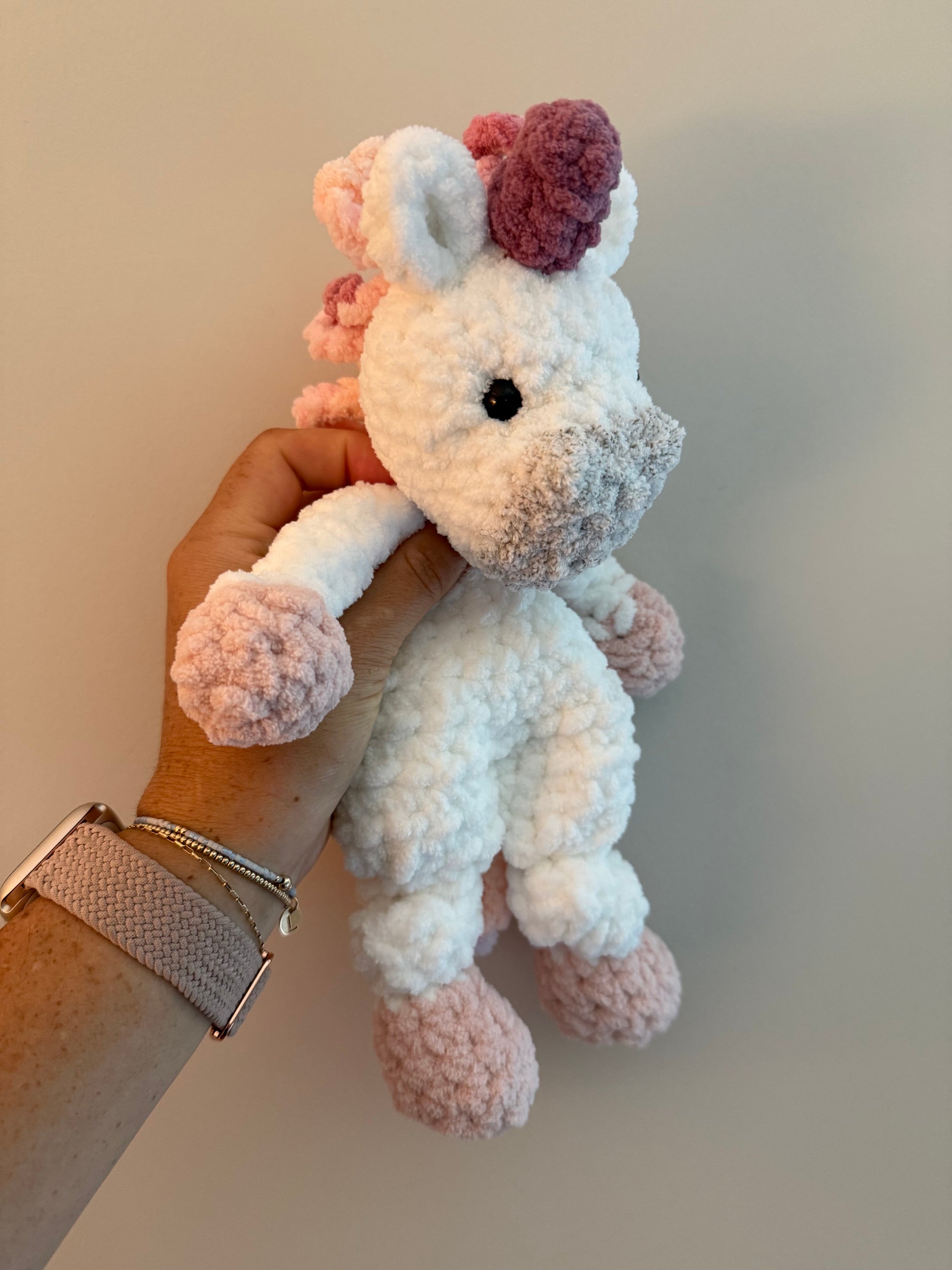 Mini unicorn lovey with a stuffed head and floppy body. Plush yarn used for an extra soft feel. Safety eyes were used with an extra reinforcement for added security. Lovey can be washed in a garment bag on delicate if necessary, otherwise spot clean only.