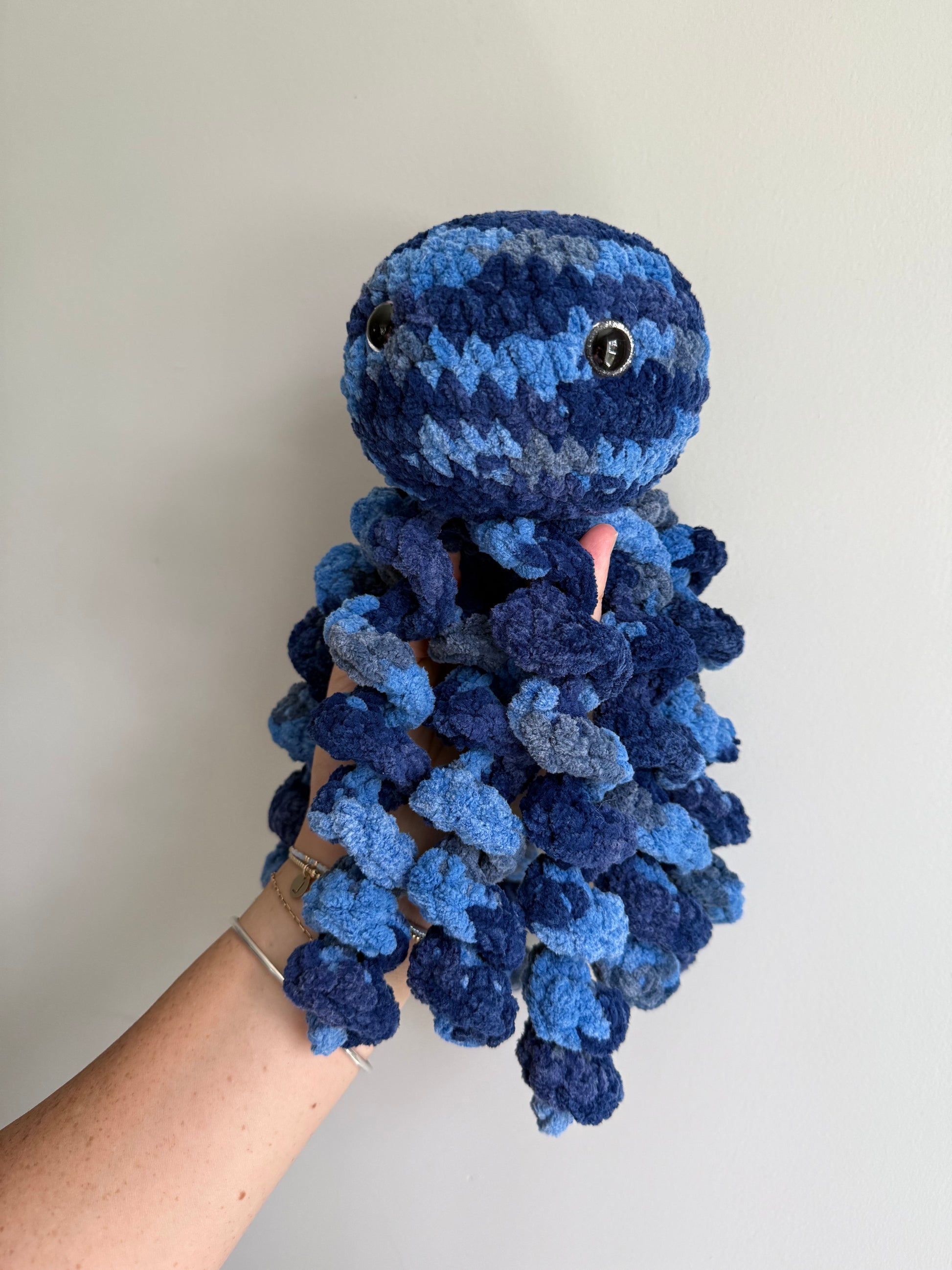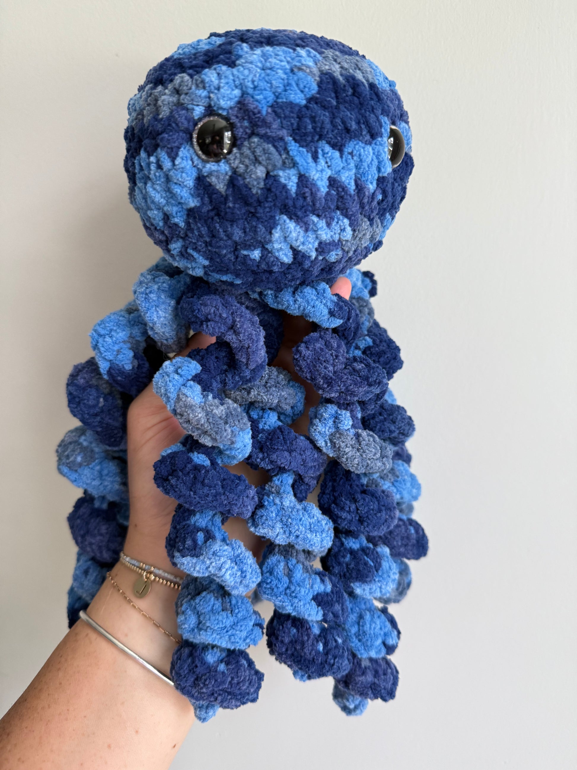 This octopus lovey is always a favorite! Children are drawn to the tentacles. Approximately 10 inches tall. The head is stuffed with a hypoallergenic polyfil and Oeko-Tex yarn is used. Safety eyes are used and reinforced for extra security. Loveys can be washed on delicate in garment bag and laid flat to dry if necessary, otherwise spot clean only to preserve the longevity of the critter.